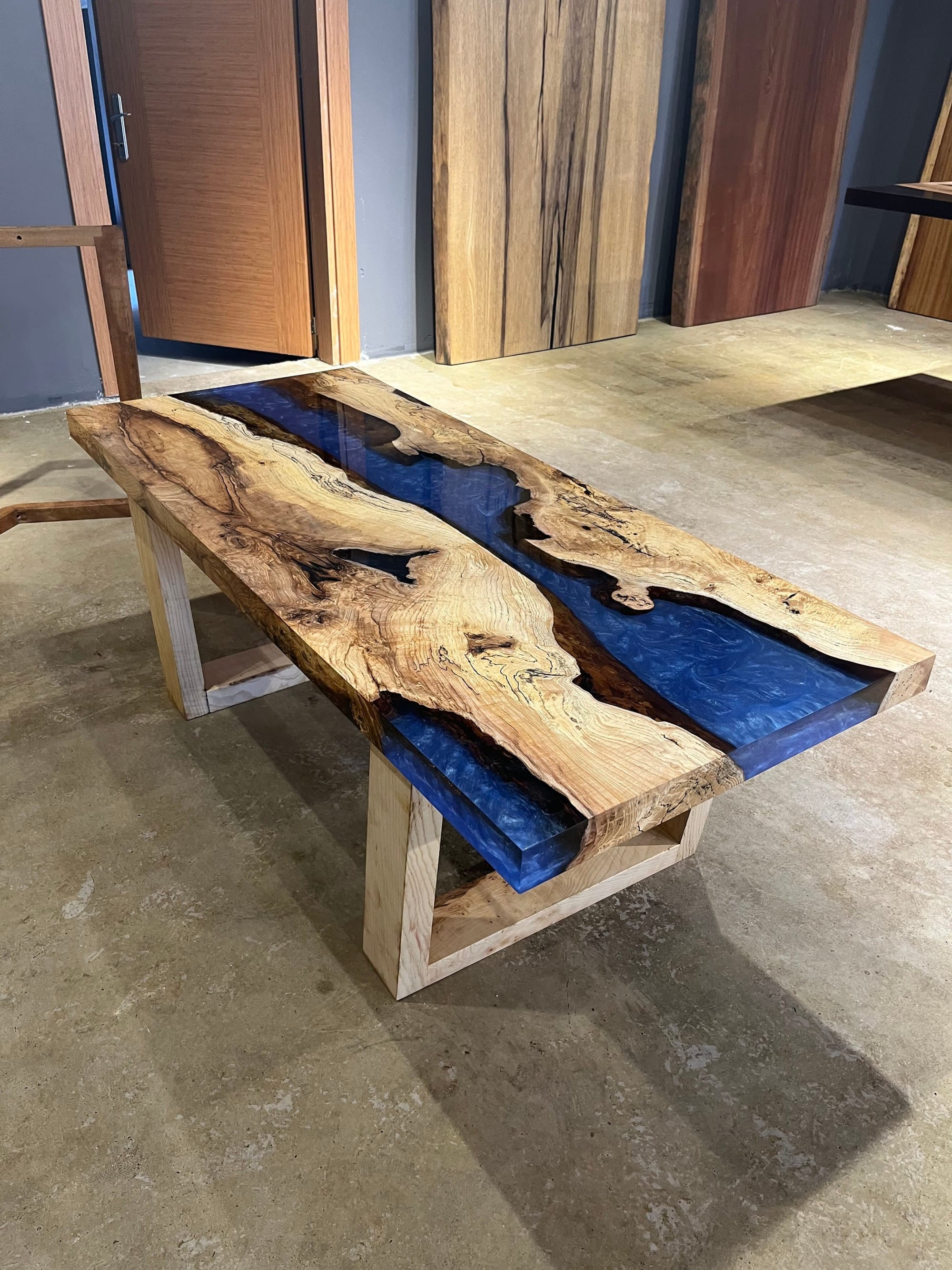 Figured Maple Burl blue resin river coffee table Untreated Art